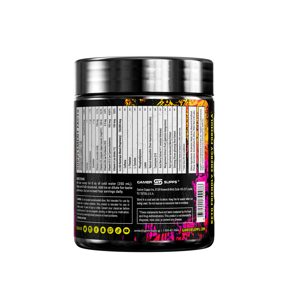 GG is the ultimate energy and focus formula designed to Level Up Your Gaming. The highest quality ingredients make up an energy formula that mixes completely and provides a healthier and more cost-effective energy drink.