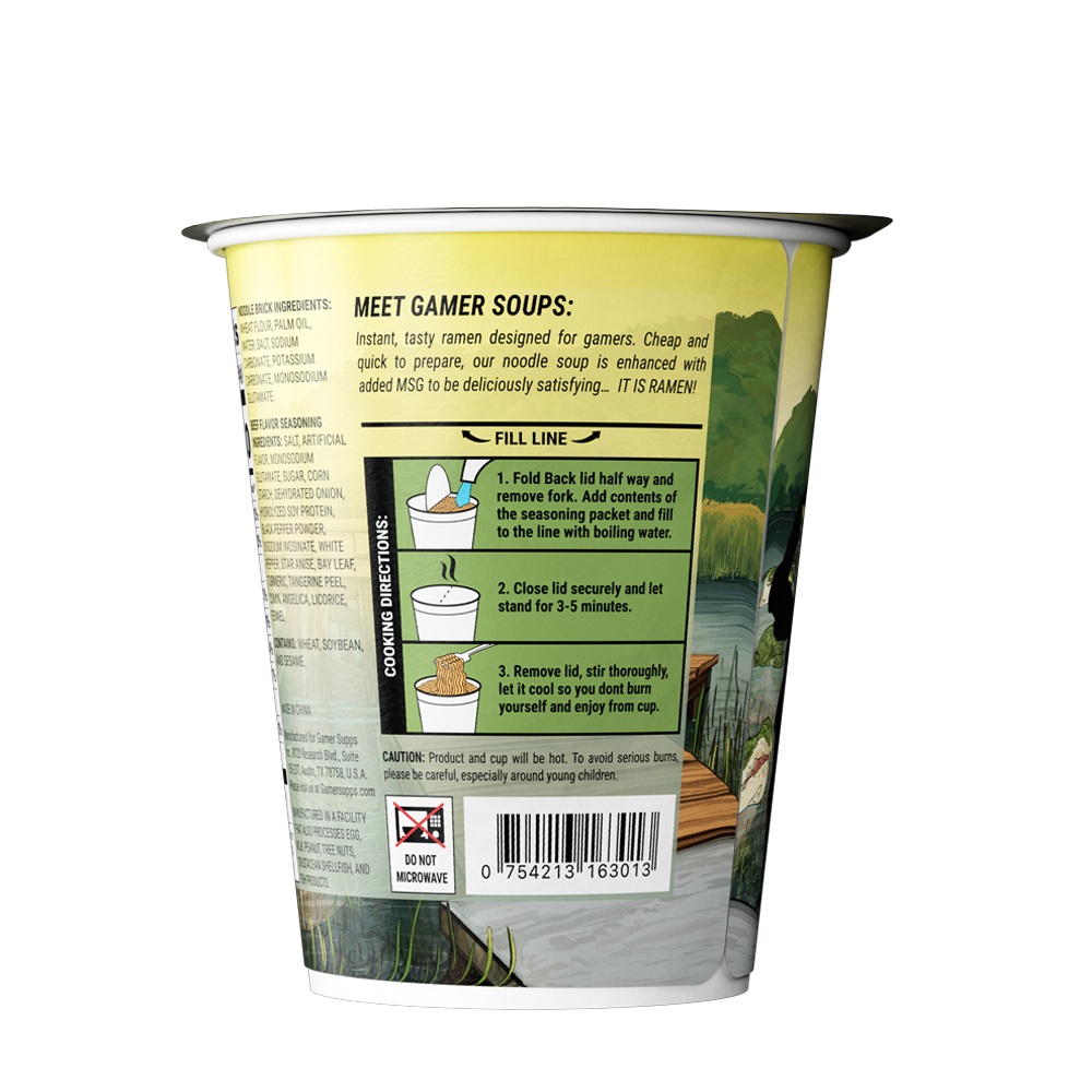 Instant, tasty ramen designed for gamers. Cheap and quick to prepare, our noodle soup is enhanced with added MSG to be deliciously satisfying… IT’S RAMEN!!!